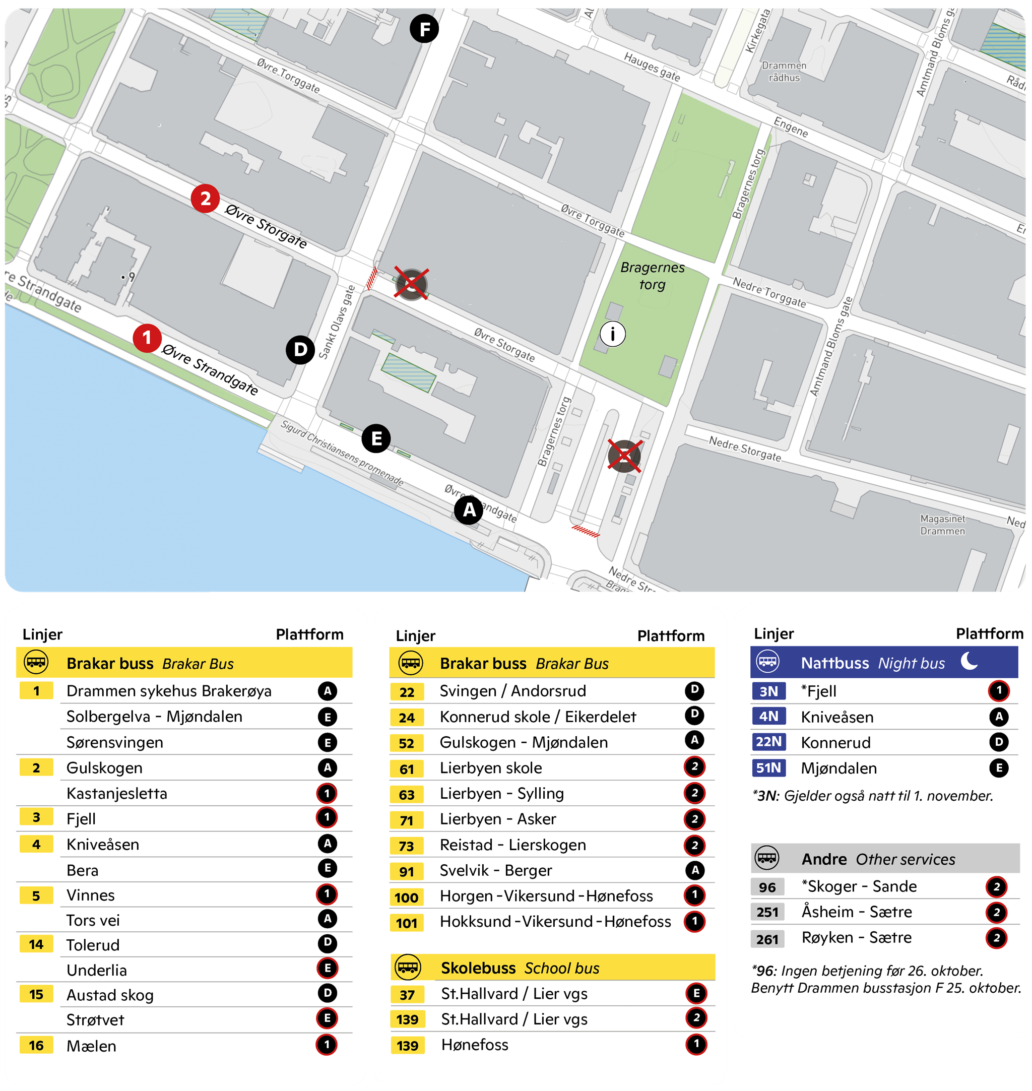 Drammen kommune stenger Bragernes torg for trafikk fra lørdag 25. oktober kl. 18.00. Årsaken til stengingen er at det skal utføres utbedringer etter en vannlekkasje. Dette medfører at veien blir stengt for buss frem til og med 31. oktober. Plattform B og C på torget blir stengt og kan ikke betjenes. Merk at kun avganger fra disse plattformene berøres av endringene.