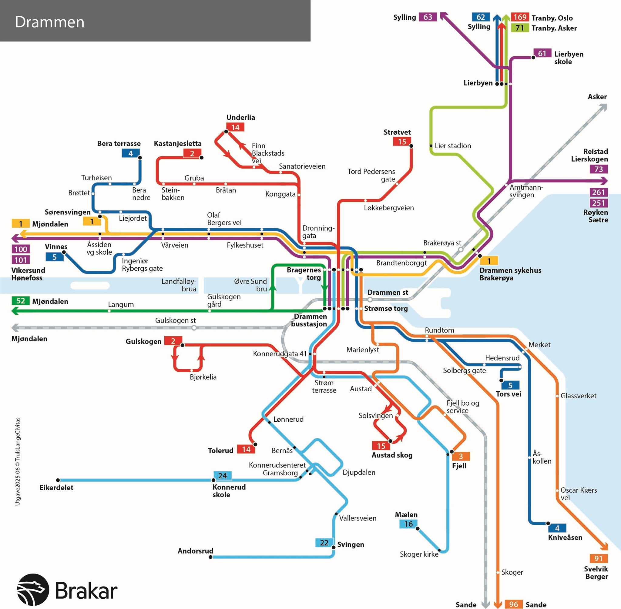 Linjekart over lokalbusser i Drammen og Lier til høsten. Vi gjør oppmerksom på at det kan komme endringer, og at oppstartsdatoen 6. oktober kun er foreløpig.