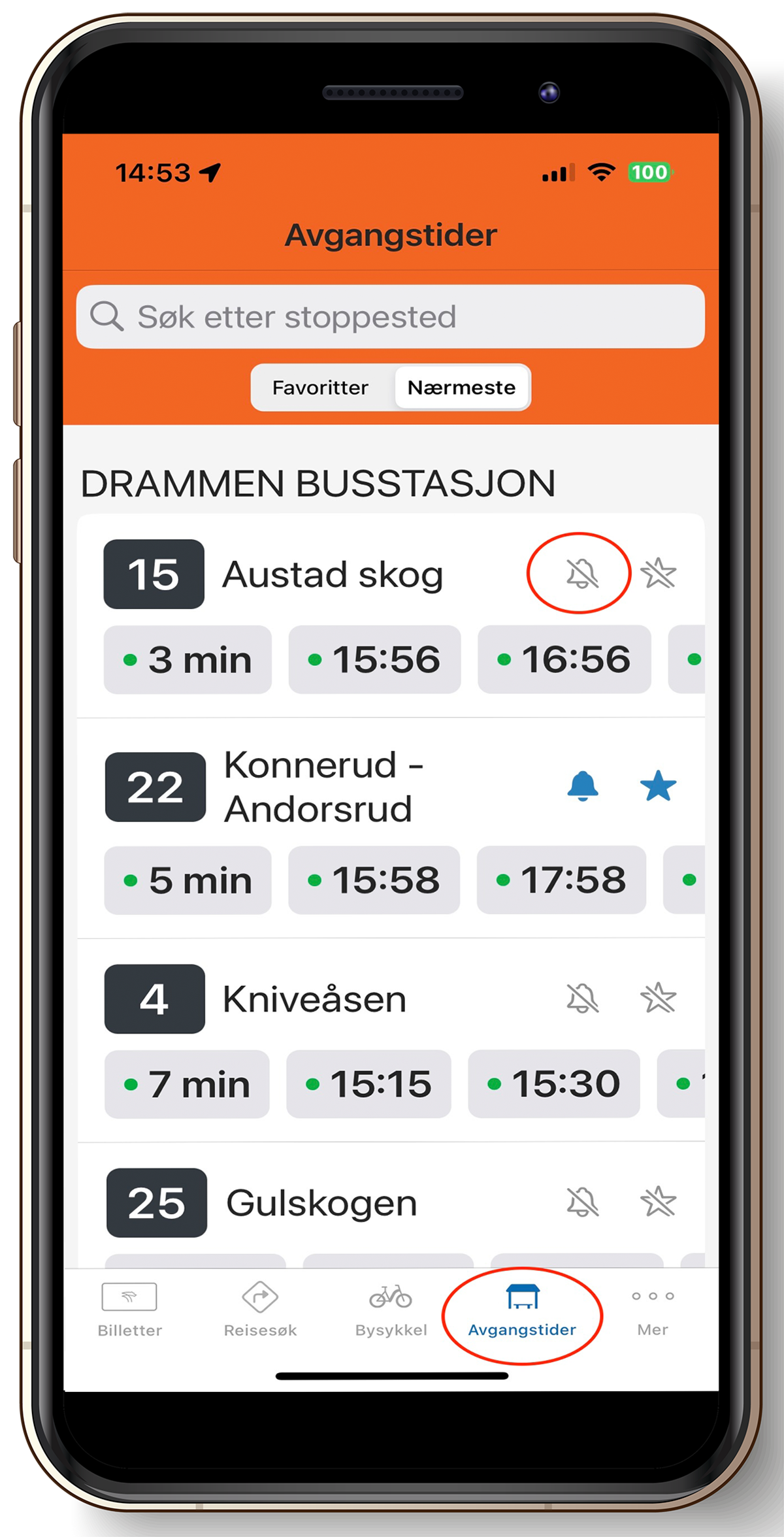 Go to Departures: Open the app and tap Departures (Avganger) in the bottom menu.