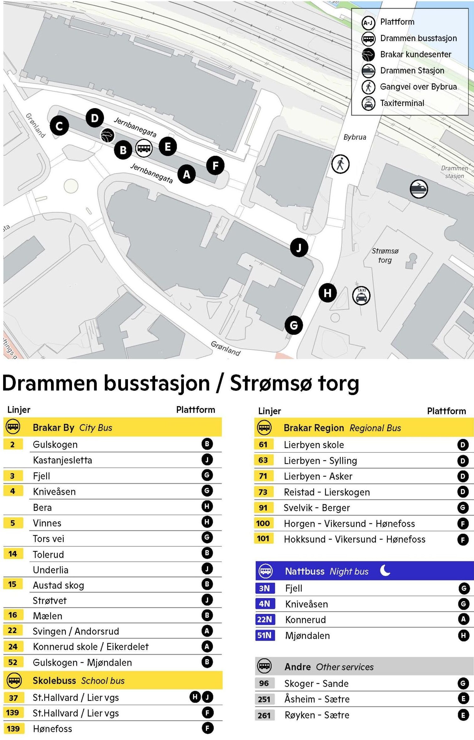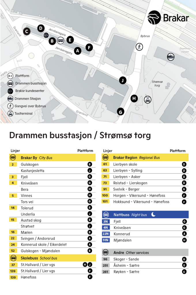 Last ned plattformkart for Drammen busstasjon og Strømsø torg (Pdf).