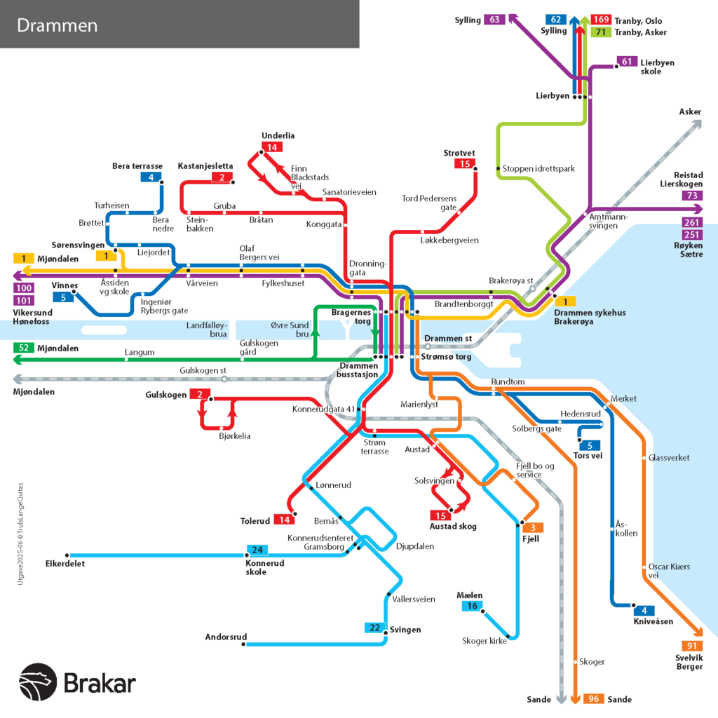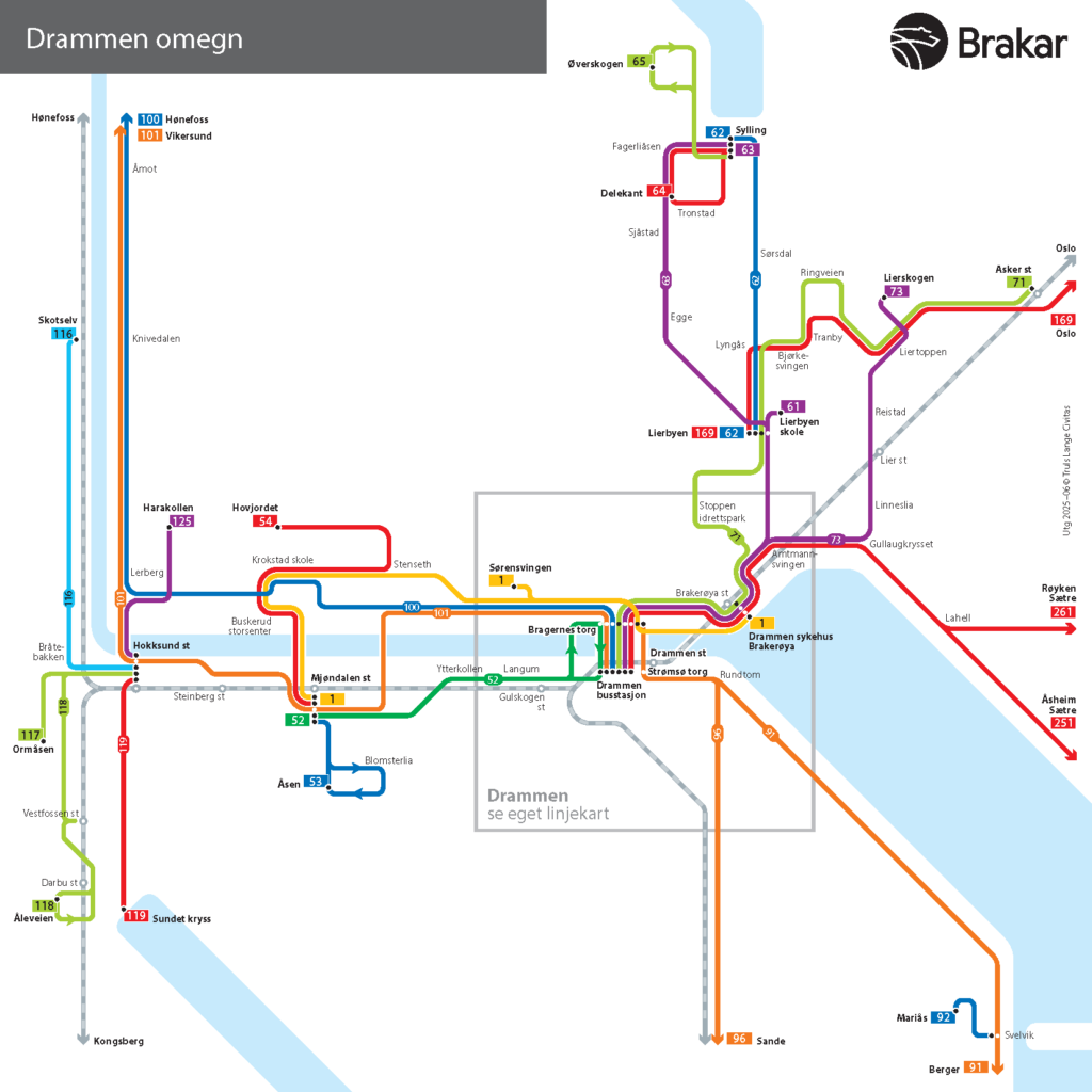 Se linjekartet for Drammen og omegn for gyldig kart høsten 2025. Dette viser ikke de nye rutene om det nye sykehuset på Brakerøya.