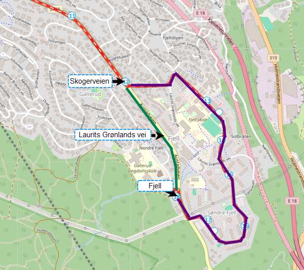 Holdeplasser: Fjell bo- og servicesenter, Ltz. Hervigs vei 51, Ltz. Hervigs vei 82, Ltz. Hervigs vei 100, Ltz. Hervigs vei 132